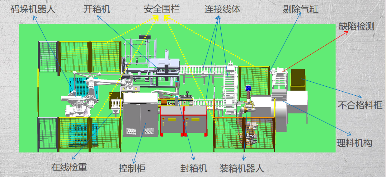 一、自動(dòng)包裝線。從自動(dòng)包裝、封口,自動(dòng)稱重,到疊包、打包、繞膜,直至成品送入貨架或立庫(kù);